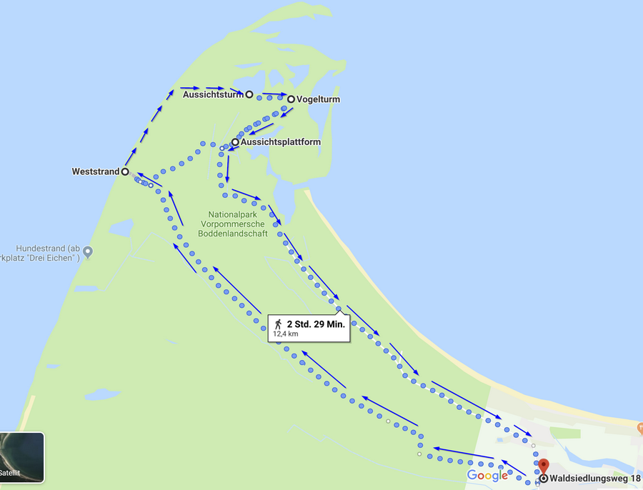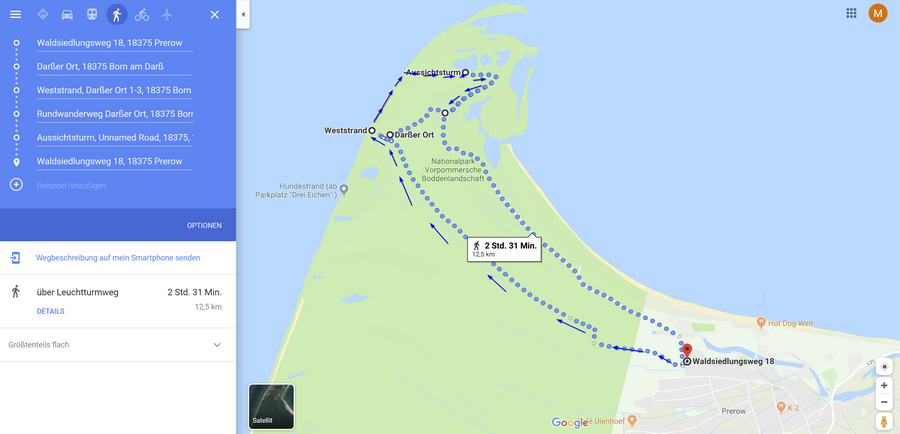 Alternative Route nach Wiek über Weststrand / Jagdhaus Darß: 5:15 h Fuß / 1:30 h Rad