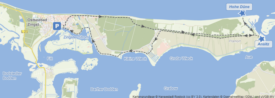 Start: Seebrücke Zingst oder Wiesenparkplatz Zingst - Seedeich - Dreiländereck - Hohe Düne - Pramort - Sundische Wiese - Müggenburg Ablage - Müggenburg - Hafen Zingst - Zingster Strom - Campingplatz am Freesenbruch – Wiesenparkplatz bzw. zurück zur Seebrücke